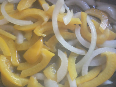 Лук и перец очистить, нарезать полосками. В сковороду от мяса добавить масла, обжарить лук с перецем, добавить фасоль, жарить минут 5 на небольшом огне до готовности овощей.
