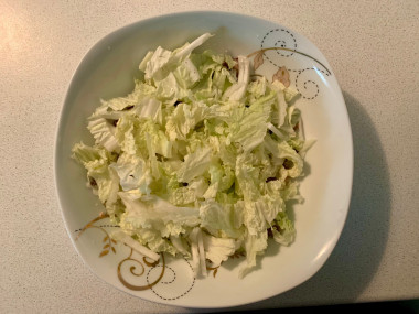 Капусту обмойте под проточной водой и хорошо стряхните от воды. Нарежьте верхнюю зеленую часть мелкой соломкой. Можете отрывать от капусты листья и резать их, как вам больше нравится.