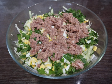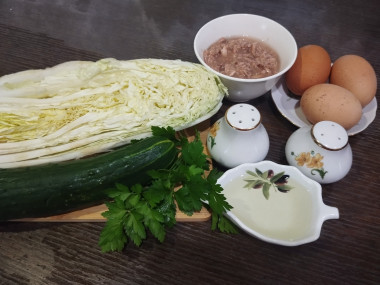 Как сделать салат консервированный тунец пекинская капуста яйца огурец? Подготовьте продукты. Вместо пекинской капусты вы можете взять обычную или любой вид зеленого салата (айсберг, латук, руккола). Тунец берите в собственном соку, если у вас консервы в масле, то уменьшите количество масла в заправке. Яйца предварительно отварите и остудите. Зелень подойдет любая — зеленый лук, укроп, петрушка. Можете добавить как что-то одно, так и ассорти из зелени.