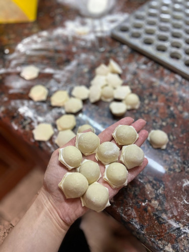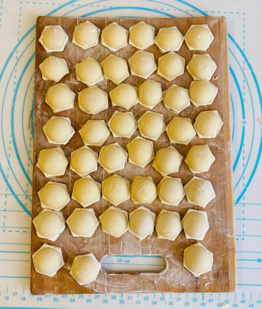Тесто получилось очень эластичное, мягкое, удобное в работе. Лепить пельмени из него очень просто. Вырезала заготовки стаканом диаметром 6 см. Получилось у меня 104 пельменя.