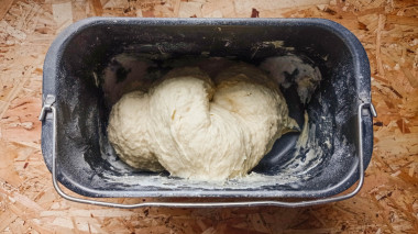 Если же тесто выходит слишком крутым, то плесните немного воды. Когда хлебопечка просигналит об окончании программы, выньте из нее ведро. Готовое тесто выложите на рабочую поверхность. Сформируйте из теста колобок.