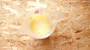 Вбейте яйцо в мерный стакан от хлебопечки. Можете использовать и обычный, просто в этом будет удобнее отмерять количество жидкости. Взболтайте яйцо вилкой. Влейте к нему такое количество воды, чтобы вместе с яйцом получилось 230 мл. Воду возьмите обычной, комнатной температуры. Той же вилкой размешайте яйцо с водой.