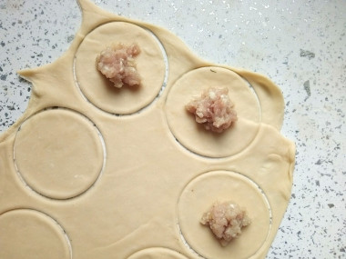 Посыпьте поверхность стола мукой. От теста отрежьте кусок и скатайте его в шар. Раскатайте его в тонкий пласт, вырежьте кружочки. Это можно сделать любой круглой формочкой. За неимением таковой, я делала при помощи обычной рюмки. Чем больше диаметр кружка, тем крупнее будут готовые пельмени.