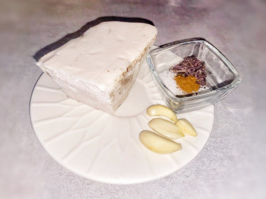 Как сделать намазку из сала с чесноком и зеленью на хлеб? Подготовьте все необходимые ингредиенты. Специи для намазки можете использовать на своё усмотрение. Сало подойдёт любое, у меня домашнее, свежее, свиное сало с прослойкой мяса.