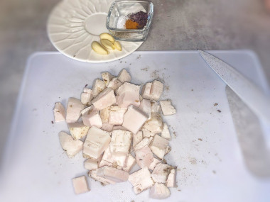 Почистите зубчики чеснока и промойте. Чеснока можете добавить больше или меньше на свой вкус. С куска сала срежьте шкурку. Порежьте сало небольшими кусочками такого размера, чтобы входили в отверстие вашей мясорубки.