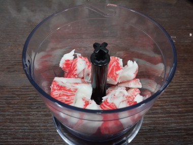 Крабовые палочки порежьте на средние кусочки и положите в блендер.