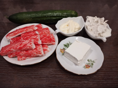 Как сделать намазку из крабовых палочек с сыром и огурцом для бутербродов? Для начала необходимо подготовить все продукты по списку. Творожный сыр заранее достаньте из холодильника, чтоб он слегка нагрелся. Крабовые палочки разморозьте, если используете замороженные.