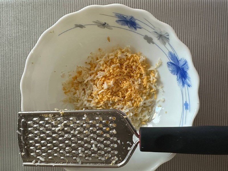 Яйца сварите вкрутую, охладите и очистите. Натрите яйца на крупной или мелкой терке. Обязательно мойте яйца перед использованием, так как даже на кажущейся чистой скорлупе могут находиться вредные бактерии. Лучше всего использовать моющие средства для пищевых продуктов и щетку. Информацию о том, как выбирать яйца, как варить, вы найдете по ссылке в конце рецепта.