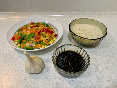 Как пожарить рис по китайски с овощами и яйцом? Подготовьте продукты. Рис возьмите ароматный — басмати или жасмин, но, конечно, подойдет и обычный. Удобнее будет варить его в пакетике. Зеленый горошек можете взять любой — свежий, замороженный или консервированный. Будет отличаться лишь время его жарки.