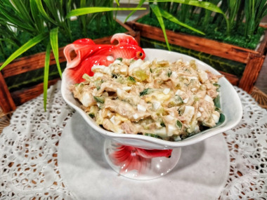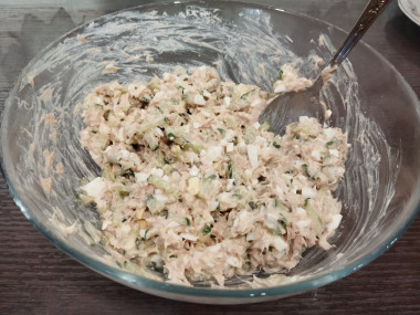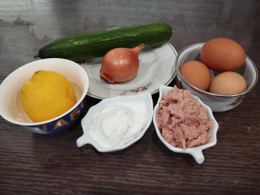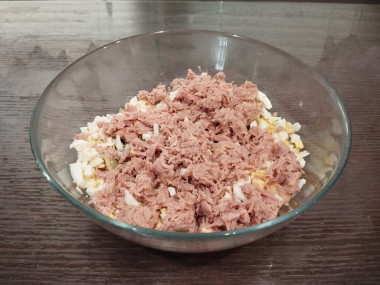 В глубокой посуде смешайте измельченные яйца, лук, огурец и консервированный тунец.