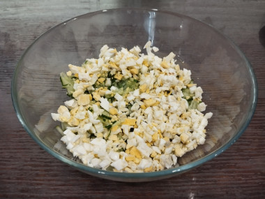 Отваренные вкрутую яйца почистите от скорлупы и порежьте мелкими кубиками.