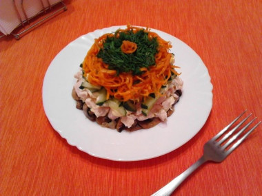 Вкусный салат Вечер с грибами, корейской морковью и курицей привел меня в восторг. Интересное сочетание вкусов ингредиентов и простота его приготовления сделала этот салат одним из моих самых любимых.