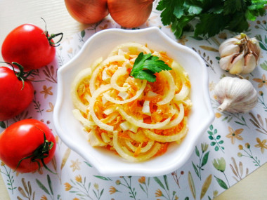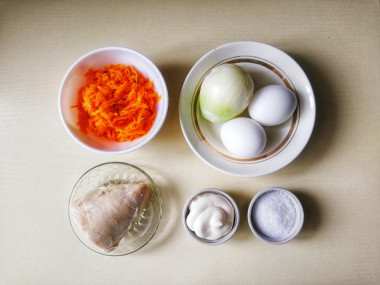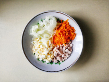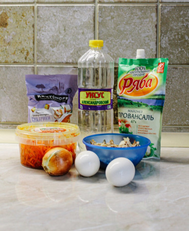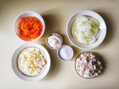 Для салата смак с морковью и уксусом мне понадобились самые обычные продукты - куриная грудка, яйца, репчатый лук и морковь по-корейски. Готовить салат проще простого!