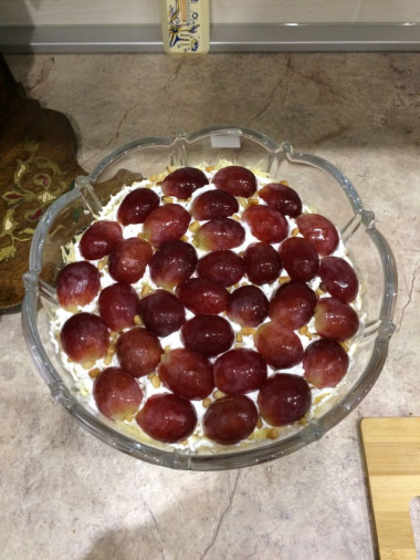 Черный виноград разрежьте пополам и удалите косточки. Уложите его наверх салата в один слой. Оставшиеся белки разложите по бокам салата. Конечно, можно покрыть бока и натертым сыром, но он имеет желтоватый цвет.