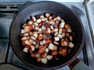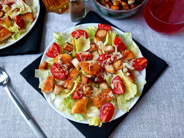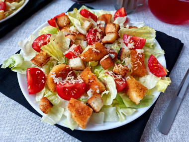 Благодаря рецепту автора сайта, приготовила вкуснейший салат с куриной грудкой и сухариками. Для салата сухарики я готовила сама из кусочков батона( порезала кубиками и