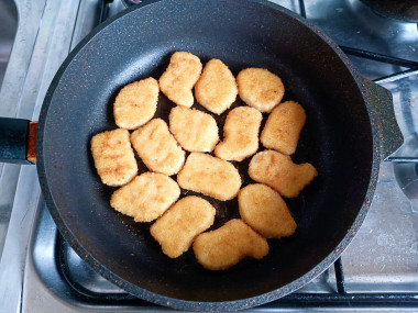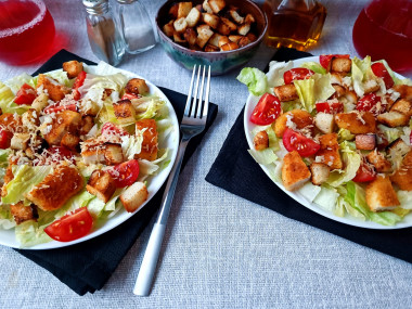 Вместо куриного филе использовала готовые наггетсы - просто обжарила их до хрустящей корочки. Сухарики сделала сама: нарезала белый хлеб кубиками, обжарила на растительном масле до золотистой корочки, в конце добавила измельченный чеснок для аромата. Вместо салата романо взяла айсберг - он тоже хрустящий и свежий. Пока готовились наггетсы и сухарики, нарезала овощи, приготовила соус, натёрла сыр.