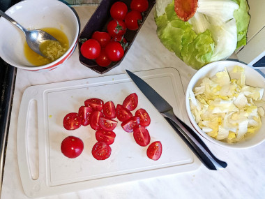 Помидоры черри вымойте и разрежьте пополам. Если берете обычный помидор, нарежьте его дольками.