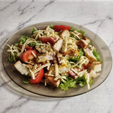 Собрала салат слоями, как в рецепте - хрустящие листья салата, кусочки курицы, яркие помидорки, сухарики золотистого цвета и нежный тёртый сыр - выглядит очень аппетитно! А соус отличная альтернатива майонезу - с приятной чесночной ноткой и легкой кислинкой. Получается гораздо полезнее, но не менее вкусно! Салат настолько сытный, что может быть полноценным ужином. Вкус потрясающий - думаю, могла бы есть его каждый день, просто варьируя ингредиенты и заправки.
