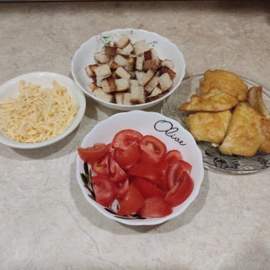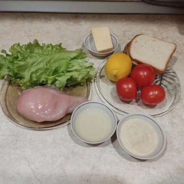 подсушила на сухой сковороде). Помидоры порезала на 4 части, листья салата порвала руками. Куриное филе крупно порезала,отбила молоточком слегка, обваляла в панировке, состоящей из панировочных сухарей,соли и перца. Обжарила на сковороде с двух сторон до золотистой корочки. После остывания порезала филе небольшими кусочками. Сыр натерла на крупной тёрке.