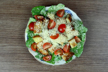 На блюдо выложите листья салата, обжаренную курицу, помидоры черри, тертый сыр и сухарики. Полейте сверху заправкой и подайте к столу. Приятного аппетита!