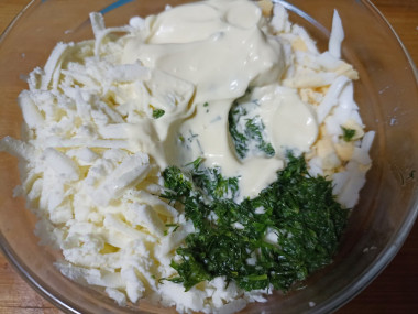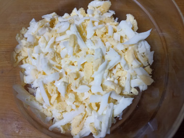 Отварные яйца почистите и натрите на крупной терке или просто разомните вилкой. Если яйца плохо очищаются, разбейте скорлупу и положите в холодную воду на 3-5 минут. За это время вода проникнет под внутреннюю пленку, и они легко очистятся. Подробнее о варке и другую информацию о яйцах можно посмотреть в ссылке в конце рецепта.