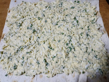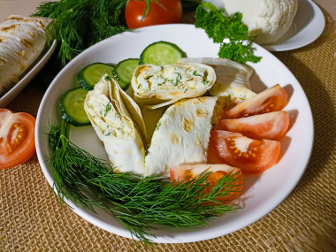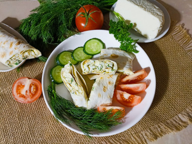 К завтраку сделала рулет из лаваша с сыром и зеленью. Брынзы у меня не было- использовала адыгейский сыр. Он более нейтральный по вкусу, поэтому вместо сметаны в начинку добавила немного майонеза. Из зелени у меня укроп и петрушка, после лёгкого обжаривания на сливочном масле зелень становится нежнее и ароматнее, на мой взгляд. Этот вариант завтрака мне очень понравился. Сытно, полезно, вкусно и готовить просто! Такой рулет хорошо подавать со свежими овощами. Спасибо за рецепт, Лялич!