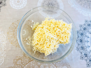 Твердый сыр натрите на средней или мелкой терке и положите в миску. Сыр возьмите по своему вкусу, но при натирании он не должен крошиться. О различных видах сыров читайте по ссылке в статье под шагами.