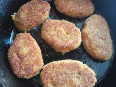 На горячую сковороду для жарки налейте немного растительного масла и выложите котлеты. Обжаривайте их с двух сторон, по 3-4 минуты, до золотистого цвета. Большой огонь делать не надо. Котлеты должны прожариться внутри и не подгореть снаружи.