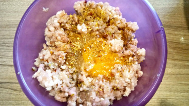 Затем добавьте яйцо. По вкусу подсыпьте немного соли и специи. И на этом этапе я добавляю в котлетную массу майонез. Именно майонез и большое количество лука придают готовым котлетам сочности. Даже в остывшем виде котлеты будут сочные и вкусные. Все ингредиенты хорошо перемешайте до однородного состояния и немного отбейте массу о дно чаши.