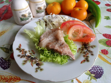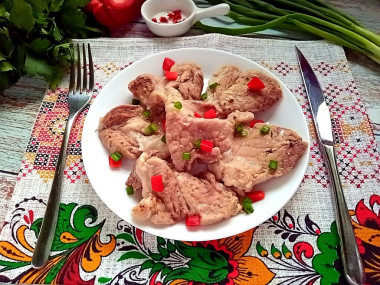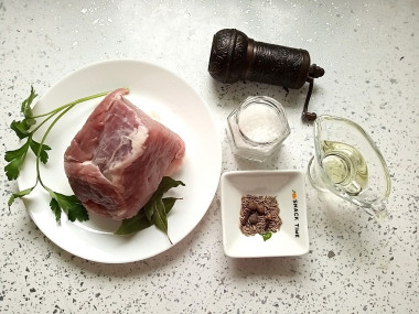 Для приготовления выбрала кусочек свинины с небольшими прожилками сала. Нарезала и отбила их через пищевую пленку. Мясо сложила в глубокую миску, посолила, поперчила и сбрызнула маслом. Мне не нравится, когда попадаются семена тмина на зубок, поэтому добавила их в воду. Туда же положила веточку петрушки, лавровые листы, душистый горошек и гвоздику. Воду наливала холодную и за час свинина прекрасно приготовилась. Мясо пропиталось ароматами специй. Масло не дало мясу высохнуть. Это очень вкусно! Пару кусочков я сразу продегустировала, а остальное оставила для салата.