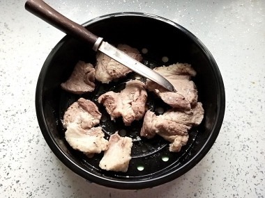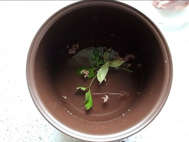 В воду по совету автора положила луковицу и лавровый лист. Свинину отбила, натëрла солью и перцем. Тмина у меня не было. Несколько звёздочек гвоздики воткнула между кусками мяса.