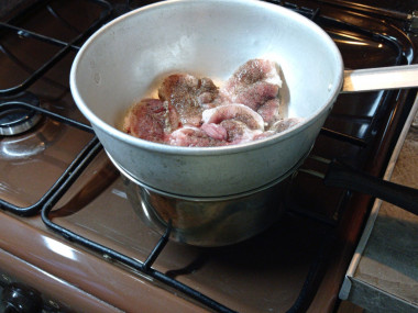Обычно я мясо запекаю или жарю. Но иногда хочется разнообразия. Решила приготовить мясо на пару. Пароварки у меня нет, поэтому пришлось соорудить специальную конструкцию: в ковш налила воды, а сверху поставила алюминиевый дуршлаг. Получилась самодельная пароварка.