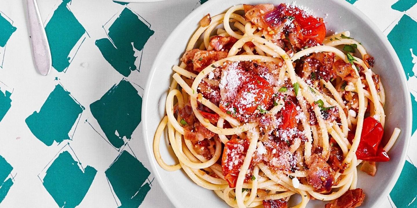 7. Выложить на тарелку готовые спагетти, сверху соус и щедро посыпать тертым пармезаном.