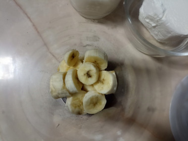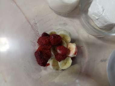 Коктейль можно сделать при помощи любого блендера — стационарного, погружного, насадки измельчитель. Я буду делать милкшейк погружным. Возьмите стакан, специальный от блендера или обычный широкий, лучше, если он будет высоким. Банан очистите и нарежьте колечками в стакан. Клубнику (или другие ягоды) помойте, обсушите и сложите в стакан к банану, отрезав плодоножки. Если у вас замороженные ягоды, то предварительно немного разморозьте их.