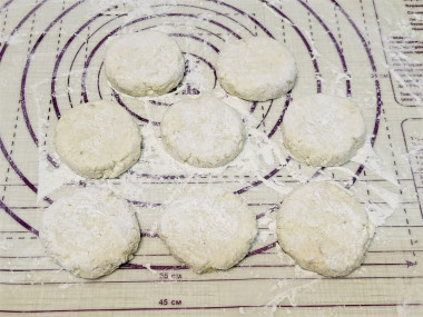 Насыпьте в тарелку немного пшеничной муки. Мокрой ложкой берите немного творожного теста и выкладывайте в муку. Руками обваляйте в муке и сформируйте небольшую лепешку. Вместо муки вполне можно использовать панировочные сухари мелкого помола.