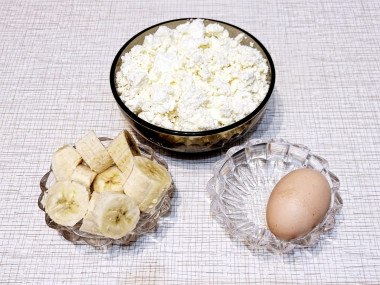 Как сделать сырники с бананом и творогом на сковороде? Подготовьте продукты. Выложите необходимое количество творога в просторную чашу. Творог используйте влажный и сочный, чтобы сырники не были сухими. Добавьте к нему яйцо и сахар.
