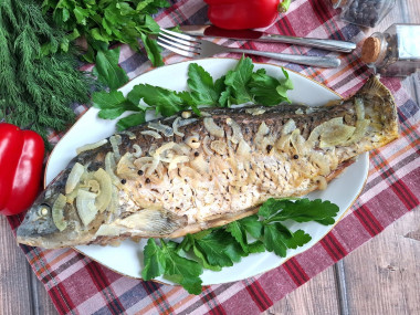 На ужин решила запечь рыбу. Воспользовалась рецептом карпа с луком в духовке целиком. Только я взяла маленького сазанчика весом 1,2 кг.