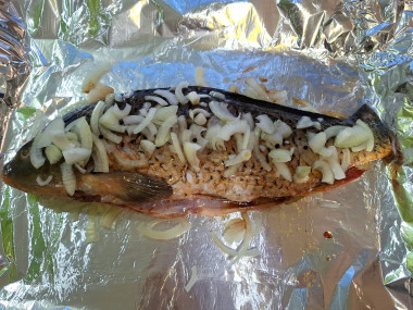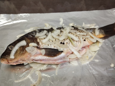 Разверните на столе лист фольги. Выложите на него треть нарезанного лука. Уложите на луковую подушку рыбу. Хорошо посолите ее снаружи и внутри. Вотрите соль руками. Еще одну треть лука положите в брюшко. А оставшуюся выложите на карпа. Полейте рыбу растительным маслом сверху. О нюансах работы с алюминиевой фольгой читайте в статье по ссылке в конце рецепта.