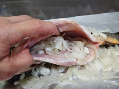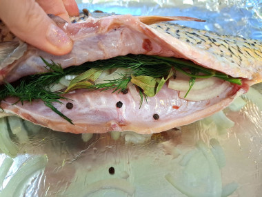 Рыба у меня была замороженная, поэтому предварительно разморозила ее в холодильнике. Затем помыла, обсушила и натерла солью. Со всех сторон смазала растительным маслом, а потом начинила брюшко. Лавровые листочки положила целиком, добавила перец горошком и лук. Дополнительно вложила пару веточек укропа для аромата. Лук выложила под рыбу, сверху и в брюшко. Он сделал рыбу сочной и вкусной! Отправила мариноваться на 3 часа в холодильник.