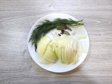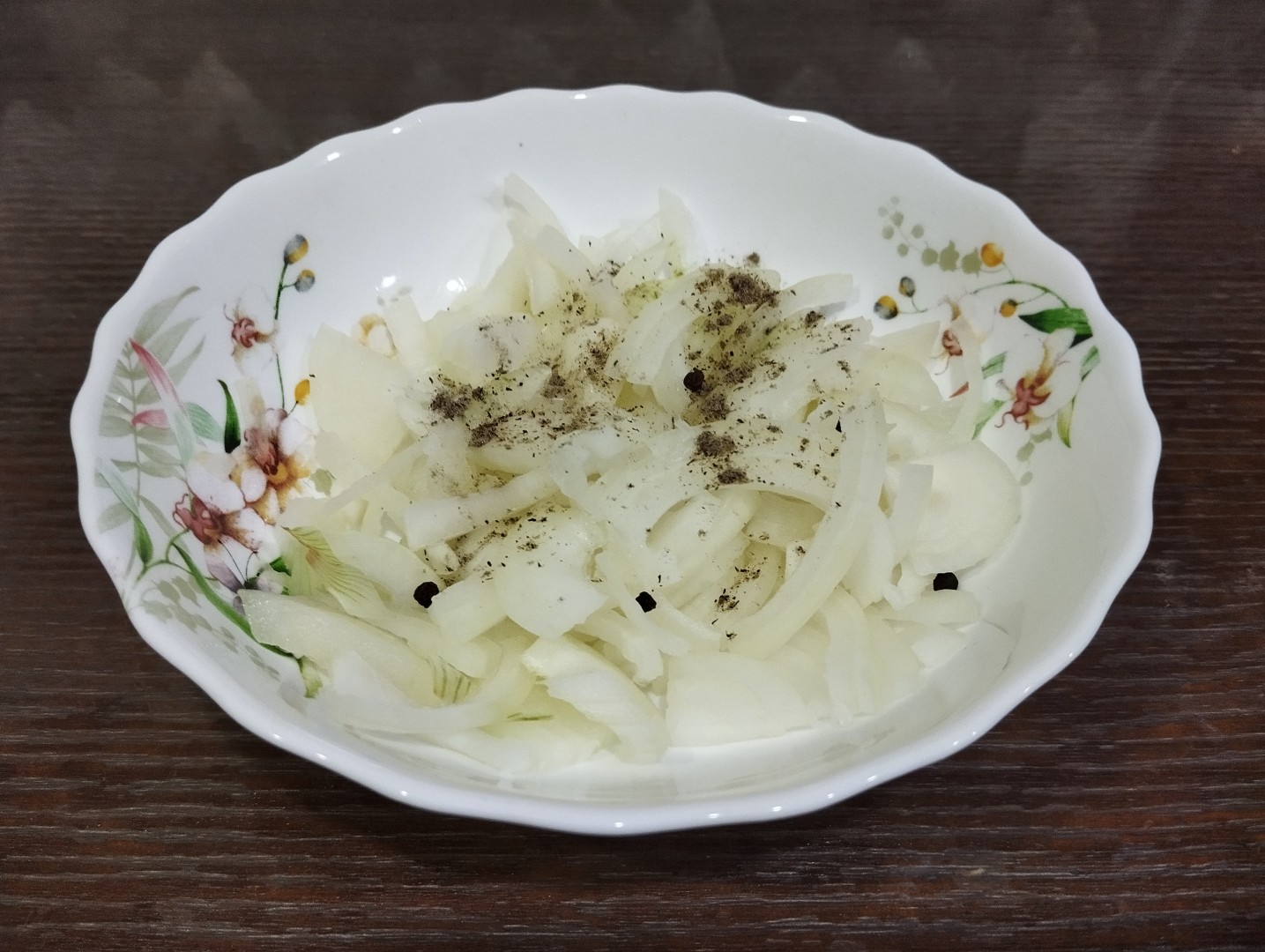Сложите нарезанный лук в миску, добавьте к нему перец горошком. Поломайте к луку лавровые листочки. Помните лук руками, перемешивая его со специями.