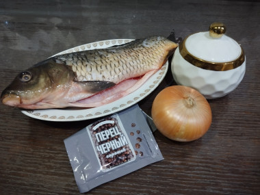 Как запечь карпа с луком в духовке целиком? Подготовьте продукты. Рыбу предварительно очистите от чешуи, удалите жабры и внутренности, хорошо промойте брюшко. У меня свежая рыба, если у вас замороженная, то разморозьте ее по всем правилам, читайте о них в конце рецепта. Также понадобится фольга.