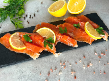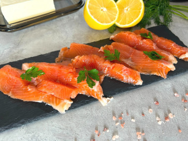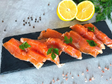 На третий день я промыла рыбу под холодной водой. Она получилась в меру соленая, так что её не пришлось дополнительно вымачивать. Слабосоленая очень вкусная, нежная, отлично нарезается на тонкие ломтики. Каждый кусочек прямо тает во рту. Лёгкий привкус мускатного ореха придаёт некую изюминку рыбу. Вся семья осталась довольна результатом.