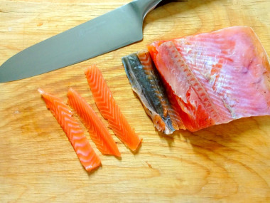 Как правильно разделать целую рыбу на филе? Удалите хвост, голову и плавники. Вдоль хребта прорежьте тушку до позвоночника. Переверните на бочок. Острым ножом срежьте мясо с хребтовой кости. Переверните тушку и срежьте филе с другой стороны. Очистите изнутри, убрав черную пленку, так как она горчит и испортит вкус. Промойте и обязательно хорошо обсушите.