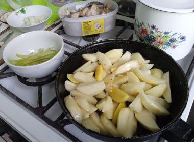 Выньте свинину из казана. Следующим этапом отправьте картофель, нарезанный крупно, обжариваться. Если у вас клубни не очень большого размера, то можно оставить их целиком. Когда картофель подрумянится, выньте его из казана при помощи шумовки.