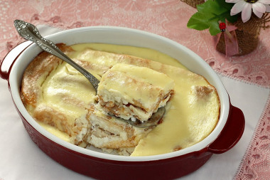 Выложите в форму фаршированные налистники в один слой. Смажьте их маслом, а затем сметаной. О том, как выбрать форму для запекания, читайте в отдельной статье по ссылке в конце рецепта.