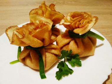 Теперь собрать блин в мешочек, завязать перышком зеленого лука.