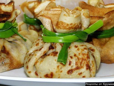 Мешочки из блинов с начинкой я уже делала однажды. Увидев рецепт на сайте, захотелось воплотить эту замечательную идею ещё раз. Приготовила блины по данному рецепту, с большим количеством яиц и без растительного масла они получились очень нежными на вкус, похожими на тонкие омлетики. Для начинки смешала куриный паштет с майонезом и зеленью. Очень хороший совет в комментариях о том, чтобы обдать перья зеленого лука кипятком - они становятся мягче и не рвутся. Но всё равно завязывать "мешочки" надо стараться осторожно. В итоге получилась оригинальная сытная закуска. В следующий раз попробую сделать со сладкой начинкой и обвязать ленточкой из сырной косички, как советуют в рецепте. Спасибо за интересные кулинарные идеи и советы!