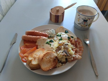 Как говаривали братья-варвары в искромётных "Няньках" "завтрак самая важная часть дня!". А что может быть важнее, чем приготовить сытный, красивый и главное полезный завтрак для любимой жены? Это не бекон шкварчит, это сердечко моё шкварчит, когда я орудую над сковородой. Два солнечных зайчика в облаках - чувственная яичница укладывается рядом с румяными сосисками. По краешку также творожный сырок с зеленью и парочка хрустящих тостов. Кус-кус с грибочками добавит полезной клетчатки. Ультрапитательный гештальт из правильно подобранных ингредиентов и вот уже любимая блаженно откидывается в кресле, наслаждаясь разливающимся в животе теплом. Завтрак для настоящих семьянинов!