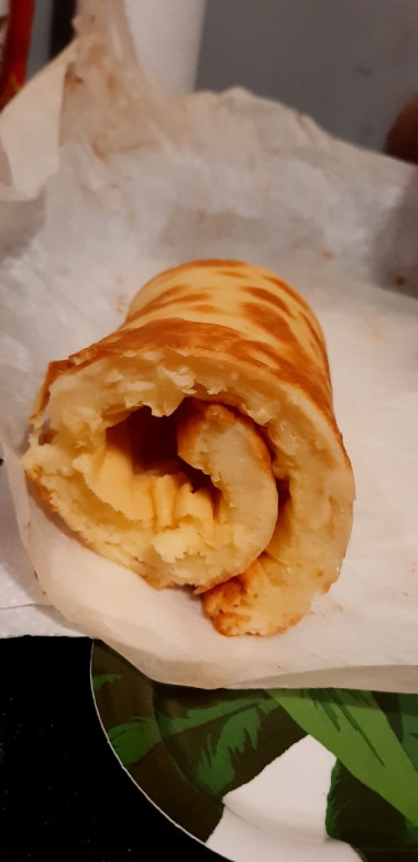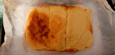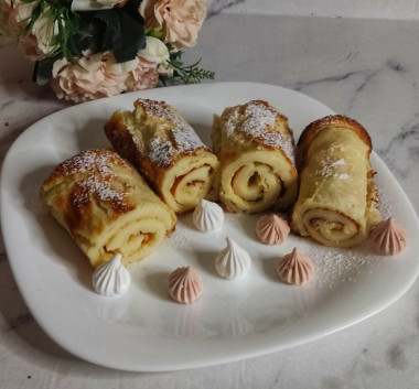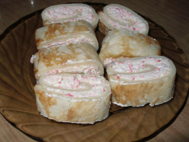 В форму, выстеленную пергаментом, вылила тесто поставила выпекаться при 200° 30 минут. Блин очень сильно поднялся. При остывании опустился. Нарезала на порции и свернула рулетиками.
