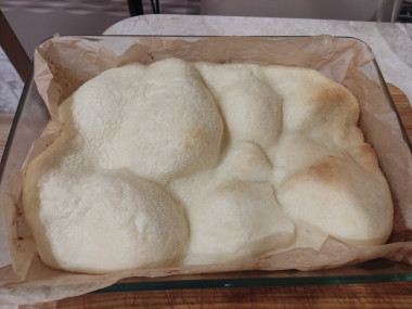 Поставьте противень с тестом в духовку, предварительно разогретую до 200°С на 20-30 минут. Блин очень сильно вздуется при выпечке, пусть вас это не пугает, так и должно быть. Он будет готов, когда хорошо зарумянится сверху. Когда это произойдет, выньте противень из духовки. Блин сразу опадет.